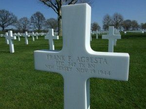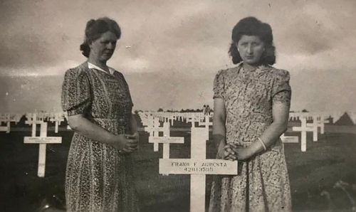 Frank Agresta was a mechanic before he enlisted in Newark, New jersey on 9 September 1943.During a rest period, two soldiers, Frank Agresta and John "Johnny" Pritchett, stayed at Mrs. Margaret and Mr. Arnold van de Berg's house. Later both were killed and were buried at Margraten. Together with their daughter, Tiny van de Berg, they adopted both graves. On the bottom photo, Mrs van de Berg and her daughter pose at Frank Agresta's temporary grave.