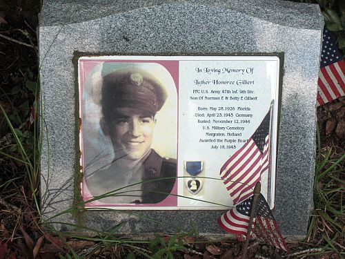 Pvt Luther H. Gilbert enlisted in Fort McClellan, Alabama on 29 September 1944.During hiuse to house fighting, Pfc Gilbert was shot in the abdoment. A comrade recalled he walked into a room, holding his guts in his hands and saying "I got shot" before he collapsed on the floor and died.