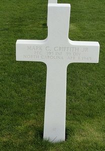 Pfc Mark G. Griffith Jr. enlisted in Camp Croft, South Carolina on 25 November 1942. He attended Matthews High School. He was employed at Camp Van Dorn, MS; Louisiana; Camp Maxey in Texas, Camp Miles Standish, Boston, MA; Le Havre, France, Rhine River, Germany.Pfc Griffith was killed in action near Fredeburg, Germany and first buried with the Protestant faith in a military cemetery in Ittenbach, Germany.