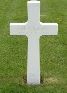When Guest's platoon was immobilized in an exposed position by two enemy machine guns and rifle fire that killed his Platoon Leader, S/Sgt Guest assumed command. Then, despite a leg wound and ignoring his comrades' pleas to remain under cover, he advanced alone upon the two weapons firing his rifle from his hip and dragging his injured leg. Three times he was knocked down by machine gun fire but each time struggled to his feet to press forward until he had killed five Germans and routed the remaining gunner. His silencing of the weapons enabled the platoon to advance and capture its objective but S/Sgt Guest was dead when his comrades reached him. His outstanding courage and sacrificial devotion to duty minimized the casualties to his platoon and were in keeping with the highest traditions of the armed forces.