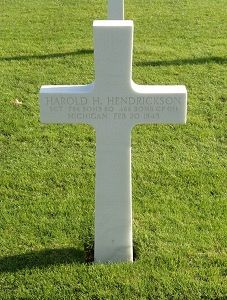 Sgt Harold H. Hendrickson joined the Air Corps of the US Army Reserve in Detroit, Michigan on 5 May 1943.The mission was aborded due to bad weather. On the way back, apparently, while the crew was over Belgium, the control cables snapped, and Pale Ale went into a spin. Everyone was getting out, when Gordon saw that two men were still in the nose. He went back to try to stabilize the plane long enough for them to get out, but the plane crashed before all three made it. 6 survived, 3 were KIA.