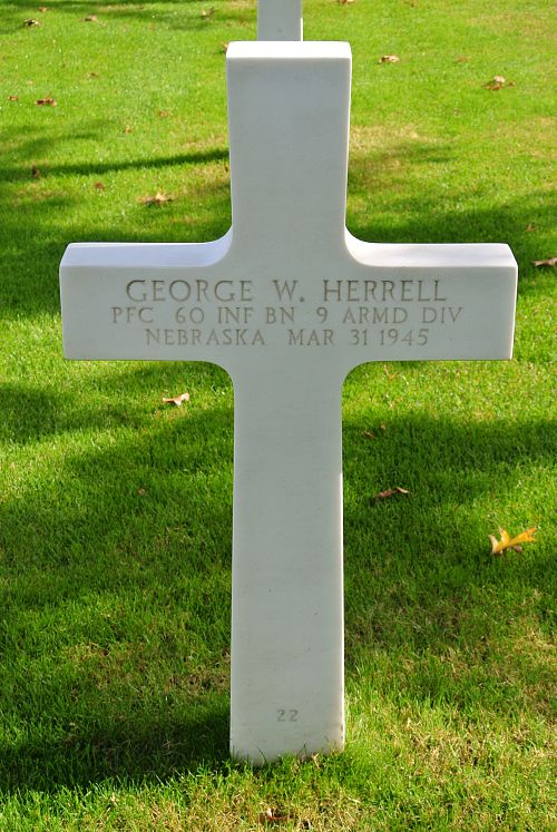 Pfc George W. Herrell attended Central High School. He was employed for several years at Killpatrick's Store and later at the Glenn L. Martin-Nebraska Company.He enlisted at Camp Dodge Herrold, Iowa on 26 June 1944 and was sent overseas in December 1944.