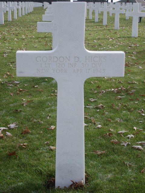 Commanding Officer, Col Branner P. Purdue, wrote the following to his family, regardin his death: "Lieutenant Hicks, who was serving as a platoon leader in Company L of this regiment, was a member of an assault force that attacked the town of Magdeburg, Germany. On this occasion he was leading tanks forward to assist the advance of the infantry when he was mortally wounded by shrapnel from an enemy shell."