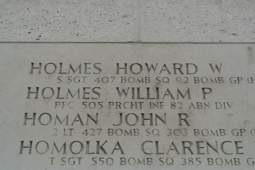 Pfc William P. Holmes graduated from Norwalk High School in 1942 and attended the Drexel Institute of Technology.He joined the U.S. Army Reserve in Philadelphia, Pennsylvania on 16 November 1942. He participated in the invasion of France on 6 June 1944.