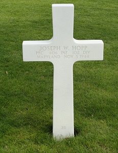 Pfc Joseph W. Hopp enlisted in Baltimore, Maryland on 23 February 1943.In the summer of 1941 and 1942 Joseph worked at the company "Maryland Drydock", in the port of Baltimore. Here Joseph saw many fallen soldiers come back from the fight. This made him sad and sparked his patriotism. He decided to enroll in the army. Prior to this, he followed a medical training. He studied at Georgetown University in Washington D.C. By the high number of victims in Europe, this training was deleted and Joseph was transferred to the infantry. Here he learned to fire with a flamethrower and he crossed the ocean as 'flame thrower'. Joseph arrived on 23 September 1944 in Cherbourg, France along with the Ozark Division. His Individual Deceased Personnel File indicates that he is killed in action in Kerkrade 'Germany' on 5 november 1944. According to the book "Letters to Home", he lost his life by a sniper.