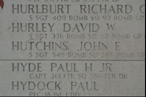 John Hutchins was a sales clerk before he volunteered for the Army of the United States in Kalamazoo, Michigan, on 16 November 1942.The airplane left the formation after a final attack by enemy fighters. It circled to the right, away from this group's formation, with #4 propeller windmilling and #1 engine smoking. It was last seen slowly spiraling downward, apparently under control.