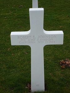 Pfc Robert E. Johnson enlisted in Los Angeles, California on 3 September 1943.His brother, A.J., was taken prisoner in the Pacific and died on one of the infamous hell boats which were torpedoed by the U.S. Navy, not knowing there were prisoners of war on board.