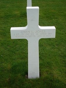 Lt Jones was awarded the Bronze Star Medal postumously for his action on the day of his death. He voluntarily went forward to contact lead elements of a task force. En route he was under intense artillery and machine gun fire. During the night, when the town was shelled, he directed the men to cover and helped organize vehicles for the advance. The medal was presented to his son in August 1945.Source of information: Allison Powers-Farrow (Jones), granddaughter, www.abmc.gov, www.wwiimemorial.com - Mrs. Marie Jones, www.ancestry.com - 1930 Census / Beede Family Tree, The Boston Globe 1 September 1945