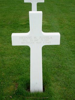 Pfc Hedvig M. Jussila enlisted in Traverse City, Michigan, on 15 June 1942. Prior to that, he had enlisted into the Civilian Conservation Corps. He trained at Camp Pickett, Virginia, Camp Blanding, Florida; Camp Forrest, Tennessee, Yuma, Arizona, and Camp Phillips, Kansas. He was sent overseas in April 1944.He was slightly wounded on 9 October 1944 in France. after recovering, he returned to duty.