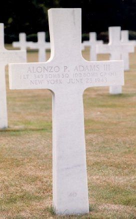1Lt Alonzo P. Adams attended Albany Academy, Yale and Williams College. He was employed by the Schenectady Gazette.The formation was unescorted, and was soon heavily engaged by German fighters, upon reaching the shore of Germany. A burst of machine gun fire evidently damaged the plane and wounded the pilot. The bail out signal was given but before the crew could respond, the aircraft exploded.