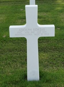 Pfc Adolph Korsak enlisted in Wilkes Barre, Pennsylvania on 25 November 1942. He was sent overseas in September 1944.His brother Martin served in New Guinea and his brother Anthony served with the Merchant Marine.