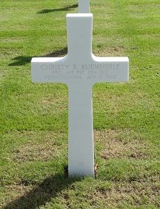 Pfc Christy R. Kuemmerle enlisted at Fort George G. Meade, Maryland on 10 April 1944.Source of information: Raf Dyckmans, Peter Schouteten, Astrid van Erp, www.abmc.gov, www.wwiimemorial.com, www.archives.gov – WWII Enlistment Record, www.ancestry.com - U.S., Headstone and Interment Record / Veteran Compensation Application File / 1930 Census