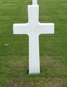 Hugh Lamont was married to Irene Smith on 24 April 1937 but they divorced on 10 May 1940.Pvt Hugh W. Lamont was wounded during the Rhine river crossing in the vicinity of Dinslaken, Germany. The exact circumstances and location of his death are unknown.
