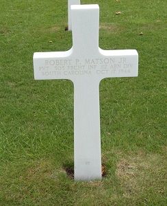 Pvt Robert P. Matson Jr. enlisted at Fort Jackson, South Carolina on 29 September 1943.Source of information: Peter Schouteten, www.abmc.gov, www.wwiimemorial.com, www.archives.com - WWII Enlistment Record, www.findagrave.com - Saratoga