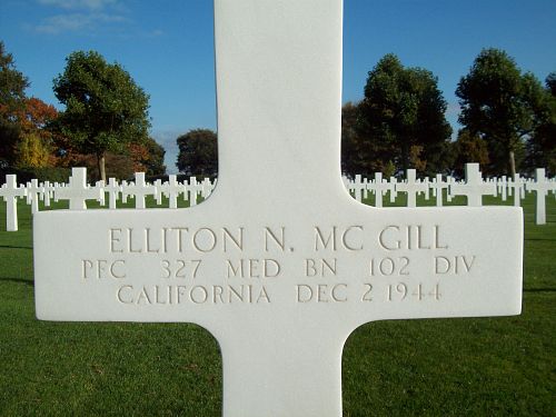 Pfc Elliton N. Mc Gill enlisted in Los Angeles, California on 14 November 1942.Source of information: André Koch, Terry Hirsch, www.abmc.gov, www.wwiimemorial.com, www.archives.gov - WWII Enlistment Record, www.ancestry.com - 1930/1940 Census / WWII Draft Cards