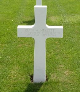 Sgt Peter A. Mezzetti enlisted in Trenton, New Jersey on 12 December 1941.The plane was badly damaged by flak in the area of Bonn, Germany, near the Rhine River. Engines were on fire, and all controls shot away, so the command to bail out was given. When next heard of the men, the right waist gunner had a leg blown off from the hip, the bombardier was wounded in the face and the neck. The co-pilot was wounded in the knee; the pilot was safe, having been blown 8,000 feet when the plane exploded; the nose gunner and navigator were killed. The navigator and nose gunner reported their wounds over the interphone. It is believed that Sgt Mezzetti didn't bail out and went down with the ship. S/Sgt Martin last saw him still in the tail turret prior to bailing out.