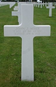 In 1937 T/Sgt John J. Mixer graduated from Turner High School, Kansas where he had played in the basketball team.He received Basic training at Fort Riley. In 1941, Sgt Mixer was a private in the Army, in Troop C, 2nd Cavalry, Camp Funston, Kansas, but by 1944 he was training at Camp Shelby, Mississippi, in the 271st Infantry Regiment of the 69th Infantry Division. In late 1944, the "Fighting 69th" shipped overseas to England and in January of 1945, began their advance through France into Germany. Although there were skirmishes and battles along the way, the worst of the fighting for the 271st took place in mid-April 1945. Mixer was one of the many casualties of that offensive that helped end the war in Europe.