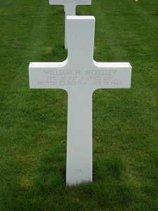 On April 13, 1945 near Ahlsdorf, Germany when a sniper shot him. Resulting in the death of Private First Class William H. Moseley. The family received a telegram that their son, father and husband was Missing in Action. A few months later his brother Hampton brought back his wallet and watch, he was also serving with his brother but did not see his body just received the items from a medic saying he had been killed. Later Bill’s wife received a telegram from one of the service men that Bill was serving with and found out he was actually Killed in Action by a German sniper who was sitting in a tree near the river – at the time of his death he was arresting a German Soldier rather than shoot him.