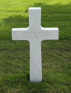 Pvt Henry K. Moyer graduated from Phoenix Union High School where he joined the Reserve Officers Training Corps. He worked for the Allison Steel Company before he enlisted in Phoenix, Arizona on 9 February 1943Source of information: André Koch, www.abmc.gov, www.wwiimemorial.com, www.archives.gov - WWII Enlistment Record, www.ancestry.com - Texas, Birth Certificates / 1930 Census / Headstone and Interment Record, http://hobbydog.net, www.newspapers.com - Arizona Republic