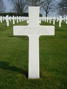 Pvt Leo M. Pastula enlisted in Philadelphia, Pennsylvania on 24 February 1943 and had been overseas since October 1944.Source of information: Peter Schouteten, www.abmc.gov, www.wwiimemorial.com, www.archives.gov – WWII Enlistment Record, www.findagrave.com – 11thacrkia, www.ancestry.com - Headstone and Interment Record / 1930 Census / Veteran Compansation Application File, www.newspapers.com - The Wilkes-Barre Record