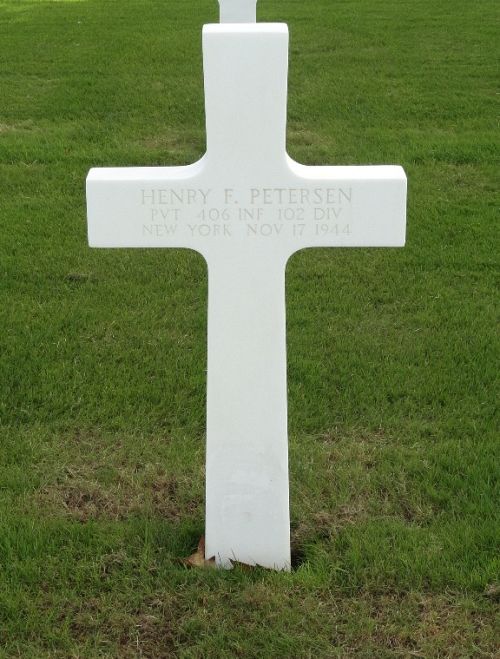 Pvt Henry F. Peterson graduated from Bushwick High School and was employed by the Home Insurance Company.He enlisted in New York on 5 February 1943. For a time he studied at Georgetown University under the A.S.T.P. program, but was transferred to Camp Swift in March 1944. He was sent overseas in September 1944.
