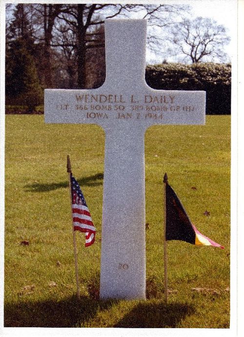 1st Lt Wendell L. Daily graduated from Kankakee high school in 1936. He was employed as a switchman on the Illinois Central railroad in Waterloo, Iowa before entering the service.Went into a steep dive as the result of direct rocket hits in the nose from FW 190s. It pulled out to a shallow incline and three parachutes were seen emerging from the plane. The plane then went into a steep dive and the eyewitnesses believe they saw the crash through ground haze at Bolbec, France.