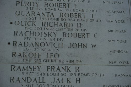 Radanovich’s name is recorded on the Walls of the Missing at Margraten American Cemetery. A rosette is placed next to his name to indicate he has been accounted for.