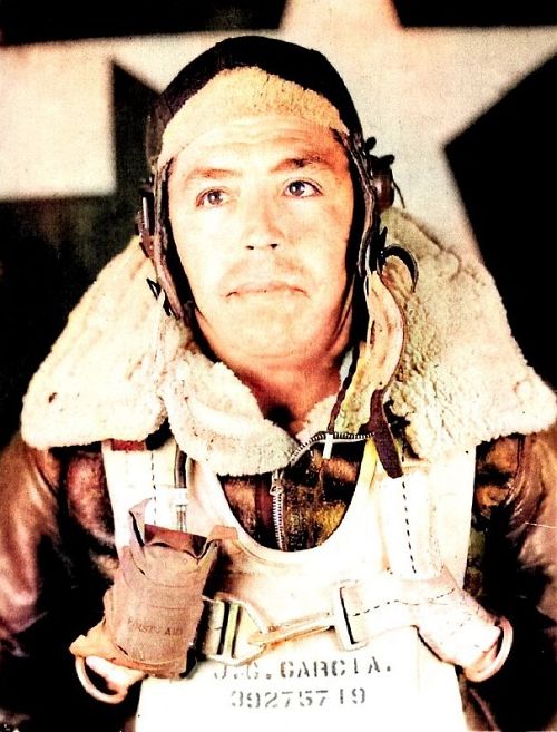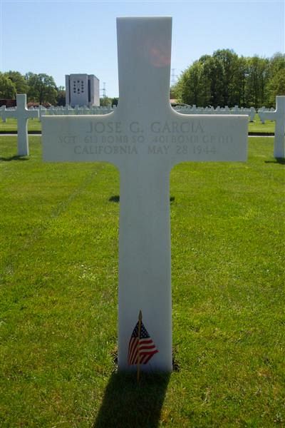 Jose Garcia enlisted on 24 September 1943 in Santa Fe, New Mexico.Flak was encountered near the I.P., at which time a burst outside the plane knocked out no. 3 engine and killed Ferguson instantly. Lt Floto states that shell fragments hit Ferguson in many places. The ship was subsequently hit by German fighters, and it was necessary to bail out. They bailed out a little northeast of the target area. Ferguson, Johnson, Mihalich, Miller and Garcia were still in the aircraft when it struck the ground. Jose was injured and last seen lying in the waist compartment.