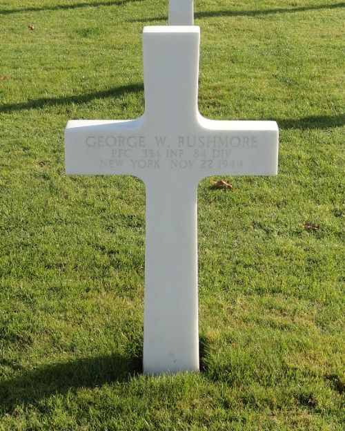 Pfc George W. Rushmore attended Bishop Loughlin High School. He also attended the American Institute of Banking and was employed by the the Corn Exchange Bank.He enlisted at Fort Jay, Governors Island, New York on 2 July 1942. After one year at Camp Gruber, Oklahoma, he was selected for the Army Specialized Training Program, and studied for nine months at Washington and Jefferson College When the program was abandoned, he was assigned to the infantry.