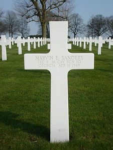 T/5 Marvin E. Sanders enlisted at Fort McPherson, Georgia on 10 March 1943.He was awarded the Silver Star Medal posthumously for distinguishing himself by gallantry in action in connection with military operations against the enemy in Germany on 16 April 1945. When his section sergeant was killed and another blinded by enemy fire, T/5 Sanders, without regard for his personal safety returned the first and proceeded to rescue one of his comrades. While returning with the wounded comrade, he was killed when the vehicle overturned. His high courage and regard for the safety of of his comrades reflects great credit on the military service of the United States.