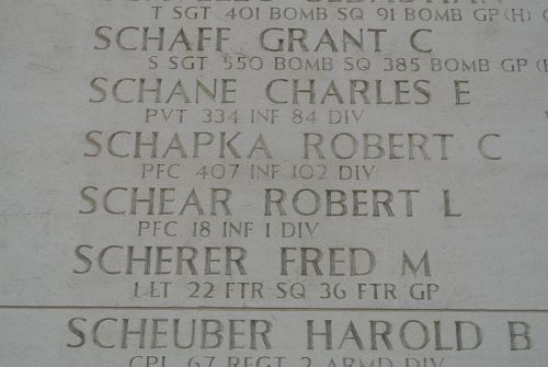 Pfc Schear was reported missing on 29 November 1944 and was officially decleared dead on 30 November 1945. He was a member of a six man patrol which did not return from a scouting mission. It is believed that they were surprised and overcome. A search was made of aid stations, but no trace could be found of him.