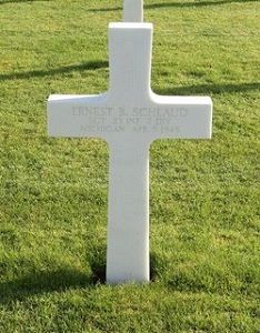 On April 9, 1945, Schlaud was cut down by shrapnel from a German artillery barrage. He had volunteerd to walk beside a tank and he was killed when a shell hit the tank and the shrapnel hit him. He died that day in a field hospital. Schlaud's commanding officer wrote his parents that he was a favorite with the men in his unit. "The men called him `Smiling Ernie,'" he wrote. "He often volunteered for dangerous duty in place of married men."