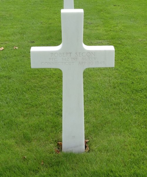 Pfc Robert Secon enlisted af Fort Devens, Massachusetts on 12 April 1944.The Third Battalion kicked off in an attack toward the Brugg River at 0800 to take the communications centers of Bonzel and Grevenbruk. The fir forest in this area was almost impassable and a heavy fog limited visibility to practically zero. About noon when the ack ack batteries first opened up, Pfc. Robert Secon, was the nearest to the enemy. He immediately opened up fire with his BAR and kept up continuous fire in covering his platoon which was attempting to reorganize. Pfc. Secon was killed in this action.