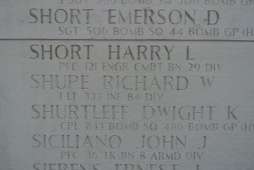 1st Lt Richard W. Shupe graduated from Central High School in 1938 where he served as President of the Hi-Y club and sang bass with the choir. He attended Central Michigan University for 2 years and sang with the college's A Capella choir. He was a clerk before he volunteered for the Army of the United States in Detroit, Michigan on 5 February 1942.Source of information: Raf Dyckmans, Terry Hirsch, www.abmc.gov, www.wwiimemorial.com, www.archives.gov - WWII Enlistment Record, www.ancestry.com - 1940 Census / Family Tree