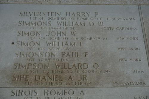 Following the end of the war, the American Graves Registration Command was tasked with investigating and recovering missing American personnel in Europe. They conducted several investigations in the Hürtgen area between 1946 and 1950 but were unable to identify Simons’s remains. He was declared nonrecoverable on 10 December 1950.