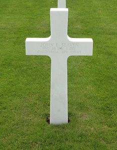 Pfc John E. Slaven attended Fresno High School and graduated from the Washington Union High School at Easton (California), where he was a member of the football and track team. He worked on the family dairy farm before enlisting.PFC Slaven joined the U.S. Army Reserve in San Francisco, California on 7 August 1942. He attended army radio school, but transferred to the air corps in the summer of 1943. He was then transferred to the infantry in December 1944. He went overseas in February 1945.