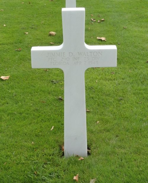 Pfc Jimmie D. Walton enlisted at Camp Blanding, Florida on 1 September 1944.He was awarded the Distinguished Service Cross (posthumously) for extraordinary heroism in connection with military operations against an armed enemy on the same day he died. According to the citation a two-man bazooka team well in advance of the company became entangled in a mesh of barbed wire in the path of enemy fire. Pfc Walton slowly worked to the entanglement and cut the wire to free the gunners, then cut a path forward through which his company could pass. When an enemy machine gun fired at him he started forward, intent upon eliminating the gun single-handed instead of seeking chelter. He was mortally wounded before he reached the machine gun.