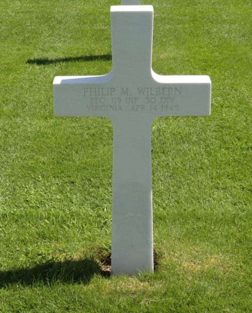 The following is written by J. Phillip Harris, a grand nephew of Philip M. Wilbern: His name was Philip Monroe Wilbern. He was known as "Pete". Pete was one of nine children of Edwin and Benna Wilbern. The four youngest brothers all had nicknames. Wilmer, Philip, Francis, and Hugh were known as "Dickie", "Pete", "Tootles" and "Taddy". They grew up on the old family farm on the banks of the James River at Blount Point in Warwick County, Virginia. My father was the only son of their oldest sister. He was about the same age as his "uncles" and spent most of his time with them. As all five came of age during World War II, one by one they entered the various branches of service until, by 1944, all five were on active duty somewhere. At the end of the war, four of them came home. Pete did not return. Notice was received that he had been killed in action just a few weeks prior to the surrender of Germany. Just a few months after the war's end, surviving brother Francis was killed, along with his new wife and in-laws in a tragic automobile accident. Both parents, Edwin and Benna Wilbern also died within the year after the war. With the surviving siblings struggling to re-establish their own lives, there was little that anyone could do to find out what had happened to Pete. All that was known was that he had been killed near Magdeburg, Germany while riding on a tank, and was buried at Margraten Cemetery in The Netherlands. In 1948, I was born and given the name "Phillip" in his honor. Through the years, the memory of "Pete" has remained in our family, however, no one ever visited Margraten or knew where to find any information about what had happened to him. Pete was inducted into the army in July 1944. By the time he went through basic and specialty training, and was transported to Europe, it was late November or early December of 1944. My father, who was on the front in eastern France, received a v-mail from him just before Christmas 1944. It was written in early December and Pete said he was near Paris, waiting for assignment. He was assigned to Company F, 2nd Battalion, 119th Infantry and joined the unit at their rest camp near Maastricht in mid December. Within days, on 16 December 1944, the Germans launched the offensive known as the Battle of the Bulge, and the 119th Infantry was immediately pulled south to counter attack the Germans in Belgium. They did not return to the Maastricht area until the end of January 1945. The unit as part of the 30th Division, XIX Corps, Ninth Army was heavily involved in the Roer offensive during February and March and finally crossed the Rhine at Wesel on 25 March 1945. They quickly made their way across central Germany as the German army began to disintegrate.More information