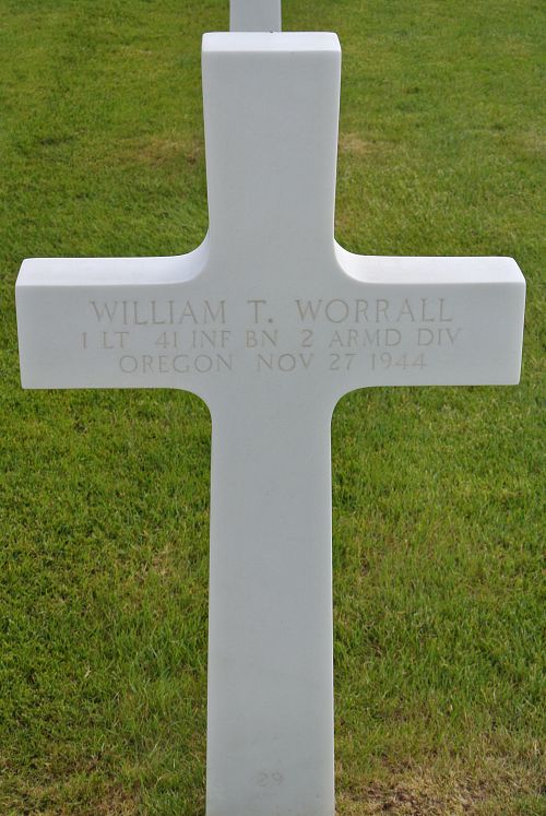 1st Lt William Worrall worked at Fort Knox, Kentucky before he enlisted in Portland, Oregon on 31 May 1942. He graduated from from officers' school in Februar 1943. His first assignment was as tank instructor at Camp Campbell. He then was sent to North Africa in May 1943 and also took part in the Sicilian.The Chaplain o fhis unit, W.F. Overhulser, wrote to his mother the following: "I had only been with this regiment a short while before Lt Worrall was killed, but in that time I had struck up quite a friendship with your son. I thought a great deal of him because he was one of the first officers I became acquainted with after I joined the regiment. He was equally well liked by everyone that knew him. His loss was a very real loss to our regiment. At the time of his death we were in a little town of Friealdenhoven (sic), Germany. It is between the German border and the Roer river in the vicinity north of Aachen. We were advancing toward the Roer in the fance of very heavy artillery fire. It was during this advance that Bill was killed. On the morning of November 27, I had quite a visit with him. He was in fine spirits and we laughed and joked as we usually did when we met. I was shocked when I heard that night he was missing. A patrol had gone out and he did not come back with them. The next day another patrol went out and found his body. He had been instantly killed with an artillery shell which had landed near his foxhole."
