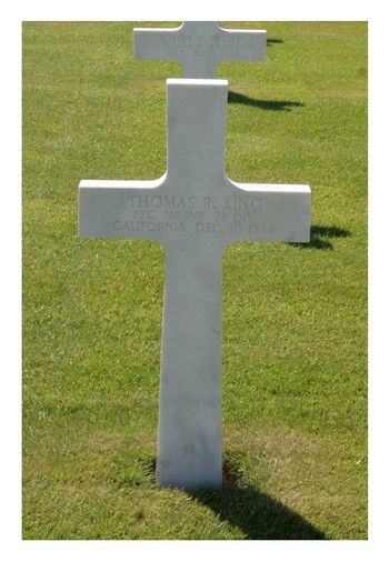Pfc Thomas R. King enlisted in Sacramento, California on 19 March 1943.Statement of Lt Flynn: On the 30th we were ordered to move about 200 yards forward and take up a defensive position, with the 3rd Platoon on the right, the 1st in the center. Upon arriving at the position we were fired upon by enemy machine gun fire from positions we could not see. Sgt. Solomon & Pvt. King were killed.