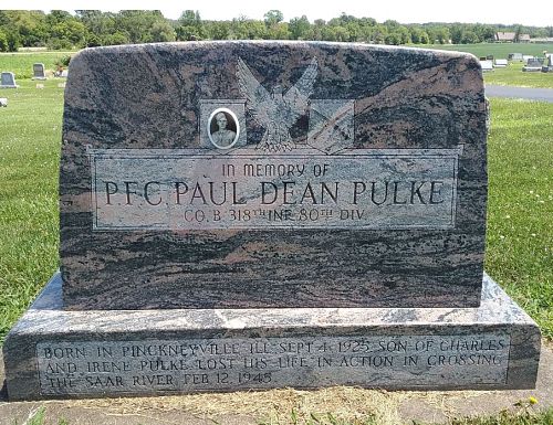 Pfc Paul D. Pulke is remembered at Mueller Hill Cemetery in Pinckneyville, Perry County, Illinois with a memorial marker.Source of information: Peter Schouteten, Terry Hirsch, www.abmc.gov, www.wwiimemorial.com, www.ancestry.com - U.S., Headstone and Interment Records for U.S. Military Cemeteries on Foreign Soil / 1940 Census, www.findagrave.com – Luv Big Red from Il, WWII Draft Card