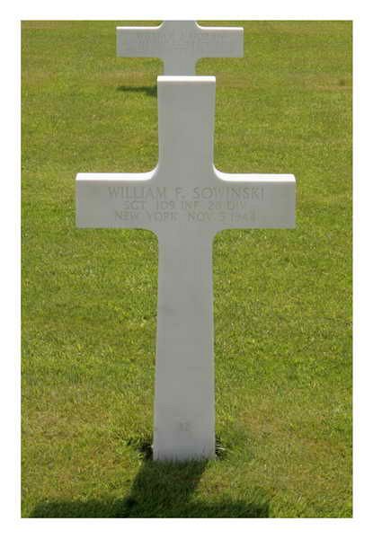 Sgt William F. Sowinski attended Olean High School. He was employed at the Fibre Forming Corporation.He enlisted in Buffalo, New York on 21 April 1941. He was sent overseas in October 1943.