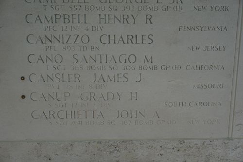 S/Sgt Canup’s name is recorded on the Walls of the Missing at Netherlands American Cemetery. A rosette is placed next to his name to indicate he has been accounted for.