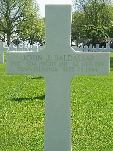 Pfc John J. Baldassar enlisted in Allentown, Pennsylvania on 9 September 1942. He volunteered as paratrooper and trained at Fort Benning in Georgia. He served in Africa, Italy and in northern Europe.Pfc Baldassar was killed at Lagewald in Groesbeek and initially buried in a fieldgrave. His remains were recoverred and he was reburied at Margraten on 20 February 1946.