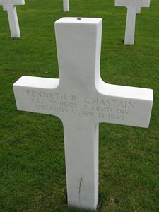 2nd Lt Kenneth R. Chastain was slightly injured in France on 30 July 1944.He was initially buried in a temporary grave at Margraten on 18 April 1945. After being disinterred and after the cemetery was given a permanent status, he was given his final resting place on 27 January 1949.