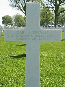 2nd Lt Carl F. Conley attended the Decatur High School with the class of 1939 and was a civil engineer before he joined the Air Corps of the United States Army Reserve in Birgminham, Alabama on 9 July 1942.The airplane was attacked by fighters who damaged #3 engine, and it began to lag behind. Witnesses saw the crew attempting to jettison equipment from the plane. It appears that all ten men did bail out although Sgt McDonald was badly wounded before leaving the ship. Some of the crew felt that Lt Harte & Lt Conley may have been killed by German civilians or soldiers after they landed.