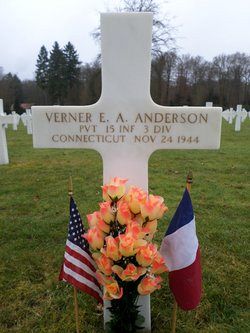 Pvt Verner E.A. Anderson worked in the machine shop of the Corbin Screw Corp. before he enlisted in Hartford, Connecticut on 21 September 1943.He was killed by artillery shell fragments in the abdomen and thorax.