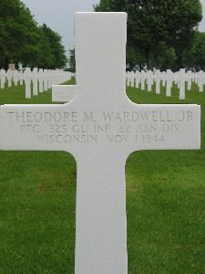 Pfc Theodore M. Wardwell Jr. enlisted in Cambridge, Massachusetts on 1 December 1942.He was born in Cheyenne, Wyoming and at the age of 5 moved with his family to Wisconsin when his father accepted the city management in Rhinelander. He graduated with the class of 1942 in Rhinelander High School, where he was one of the most popular of the student body. He was active in band and intramural athletics. In the fall of 1942 he enrolled in Massachusetts Institute of Technology, preparing for a career in engineering. The following spring he entered service and was assigned to Camp Roberts, in California, for basic training. On completion of basic, he enrolled in the Army Specialized Training Program and assigned to City College of New York for engineering service. When the ASTP activity was curtailed, he requested combat assignment and was sent to Fort Bragg, where he was trained with a tank destroyer unit.