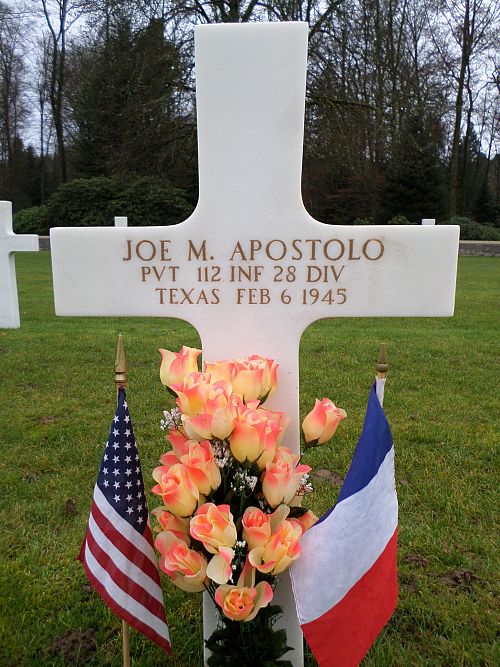 Pvt Joe M. Apostolo enlisted in Houston, Texas on 3 December 1943.Source of information: Peter Schouteten, www.abmc.gov, www.wwiimemorial.com, www.archives.gov – WWII Enlistment Record, www.ancestry.com - Headstone and Interment Record / Sechelski Elison Family Tree, www.findagrave.com, http://112th-infantry.blogspot.com/