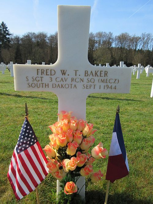 S/Sgt Fred W. T. Baker joined the Regular Army on 14 January 1939.He was awarded the Silver Star Medal posthumously for his action on the day of his death. The citation cited: For gallantry in action as a member of Troop B, 3rd Cavalry Reconnaissance Squadron (Mechanized) on 1 September 1944 in Thionville, France. S/Sgt Baker was on an advance reconnaissance mission with his platoon which was attempting to capture a bridge that the enemy was trying to destroy. On receiving word that his platoon commander, who was across the bridge, was seriously injured, S/Sgt Baker drove across in his vehicle, dismounted in utter disregard for his own personal safety, to assist the commander, and take charge of the platoon. While so engaged S/Sgt Baker was shot and mortally wounded. S/Sgt Baker's display of courage was an inspiration to all around him and was in keeping with the highest military traditions.